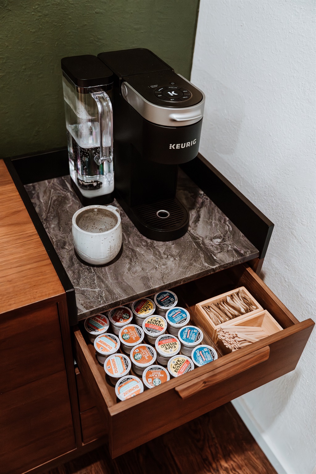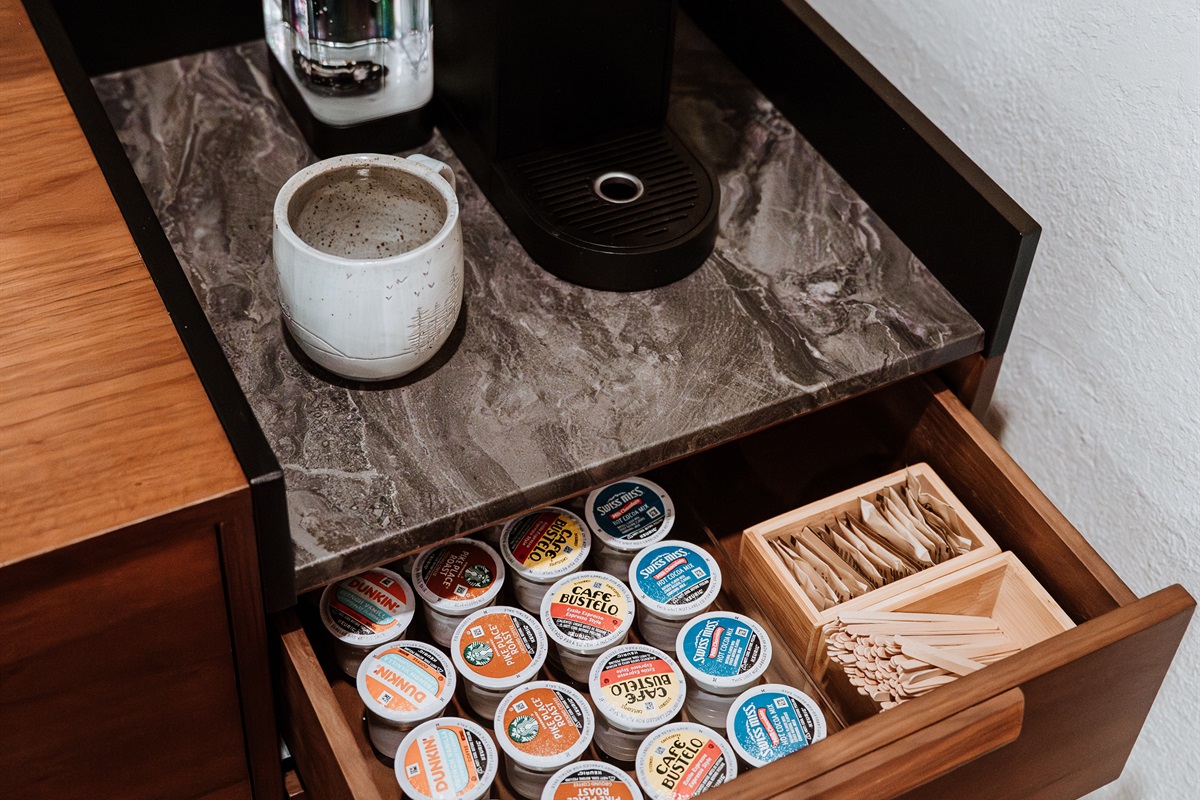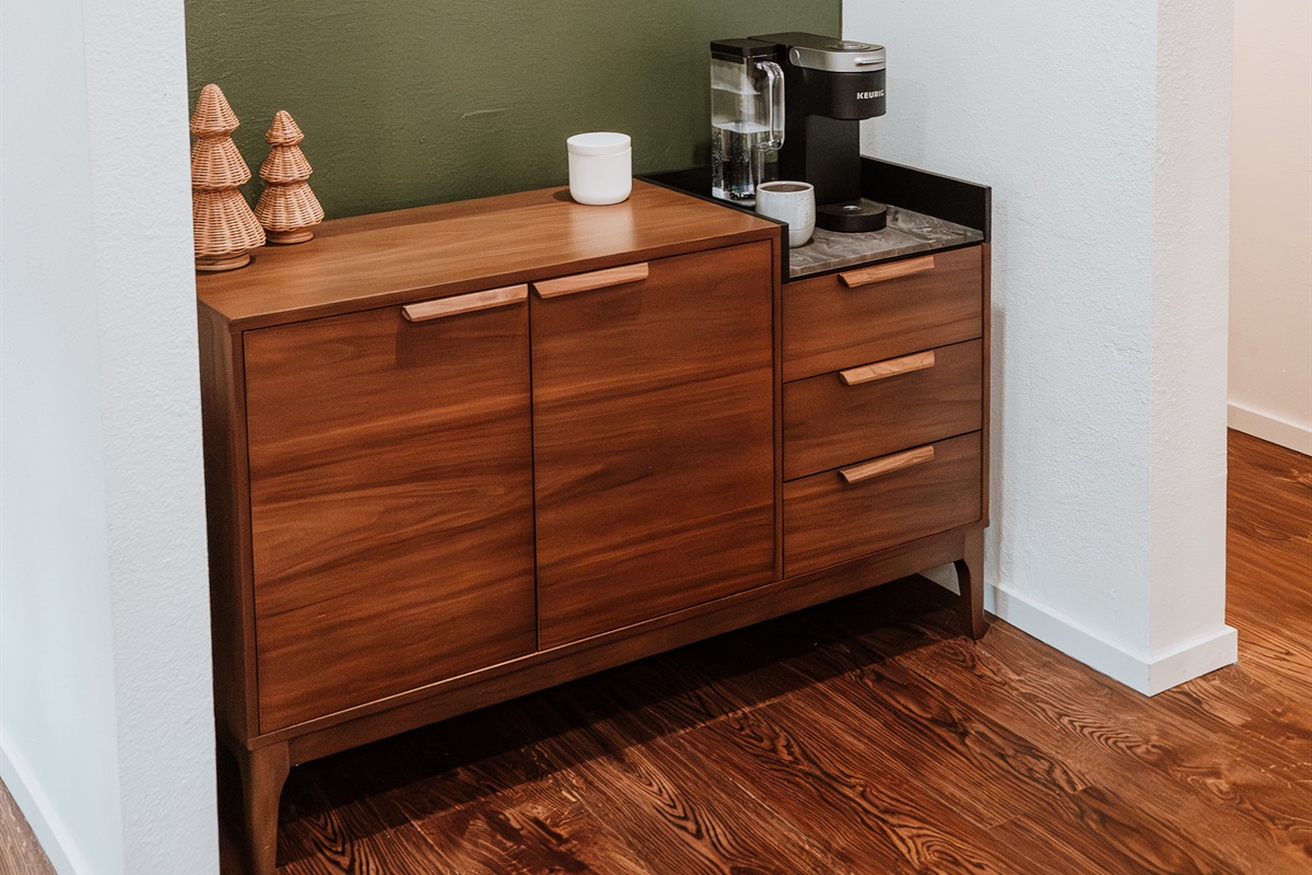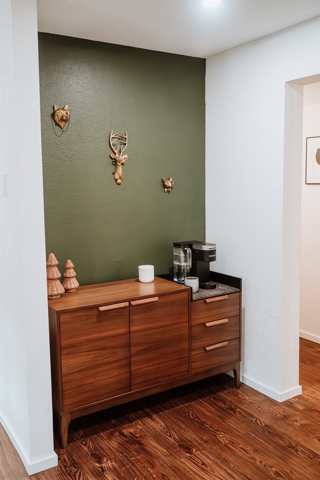 The kitchen is fully equipped with modern appliances, including a refrigerator, stove, oven, microwave, and dishwasher, making it perfect for preparing meals. There's ample counter space for food prep, and all essential cookware, dishes, and utensils are provided. Coffee lovers have a choice of drip coffee or French press (coffee is provided) and a Keurig machine with a selection of Keurig capsules are located in the little coffee bar on the ground floor. Those who prefer tea will find a stylish electric kettle and a tea pot (black tea is provided). Adjacent to the kitchen is a cozy dining area with a stylish table and seating for 8. Whether you're enjoying a quick breakfast at the kitchen bistro table or a family dinner, it offers a comfortable space for meals and gatherings.