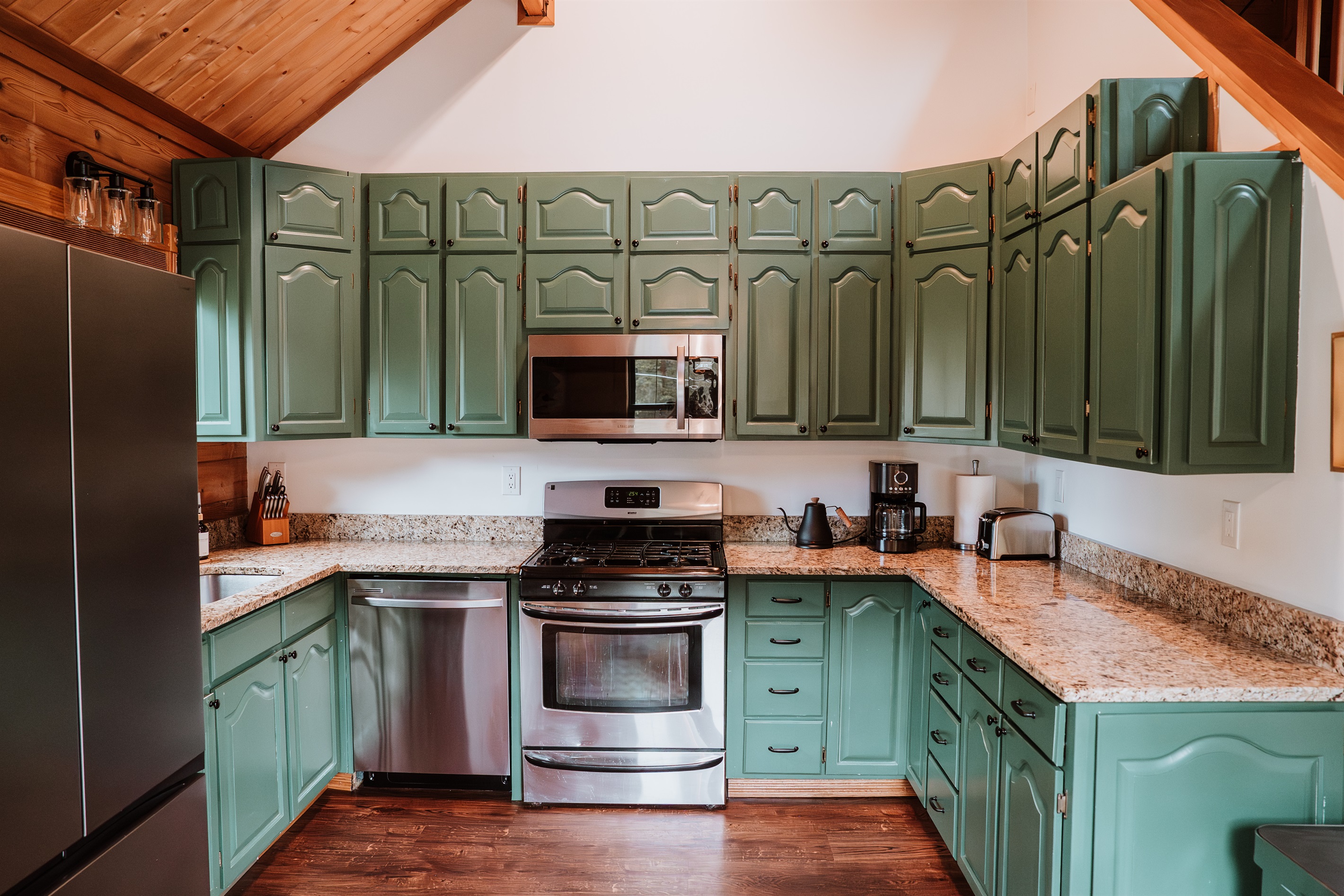 - Kitchen with microwave, gas range, oven, toaster, drip coffee maker, French press, Keurig machine, electric kettle, blender
